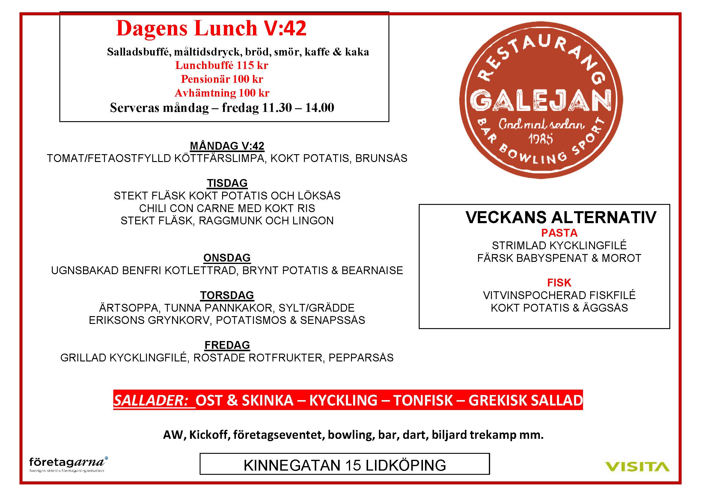 Galejan är mest kända för vår lunchrestaurang i Lidköping, men vi erbjuder även skräddarsydd catering och professionella konferenstjänster. Med stor erfarenhet och en fingertoppskänsla för detaljer, garanterar vi att din tillställning blir precis som du föreställt dig. Upplev Galejans mat och service som får dig och dina gäster att känna sig speciella.
